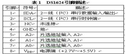 DS1624是美国DALLAS公司生产的集成了测量系统和存储器于一体的芯片。数字接口电路简单,与I2C总线兼容,且可以使用一片控制器控制多达8片的DS1624。其数字温度输出达13位,精度为0.03125℃。DS1624可工作在最低2.7V电压下,适用于低功耗应用系统。